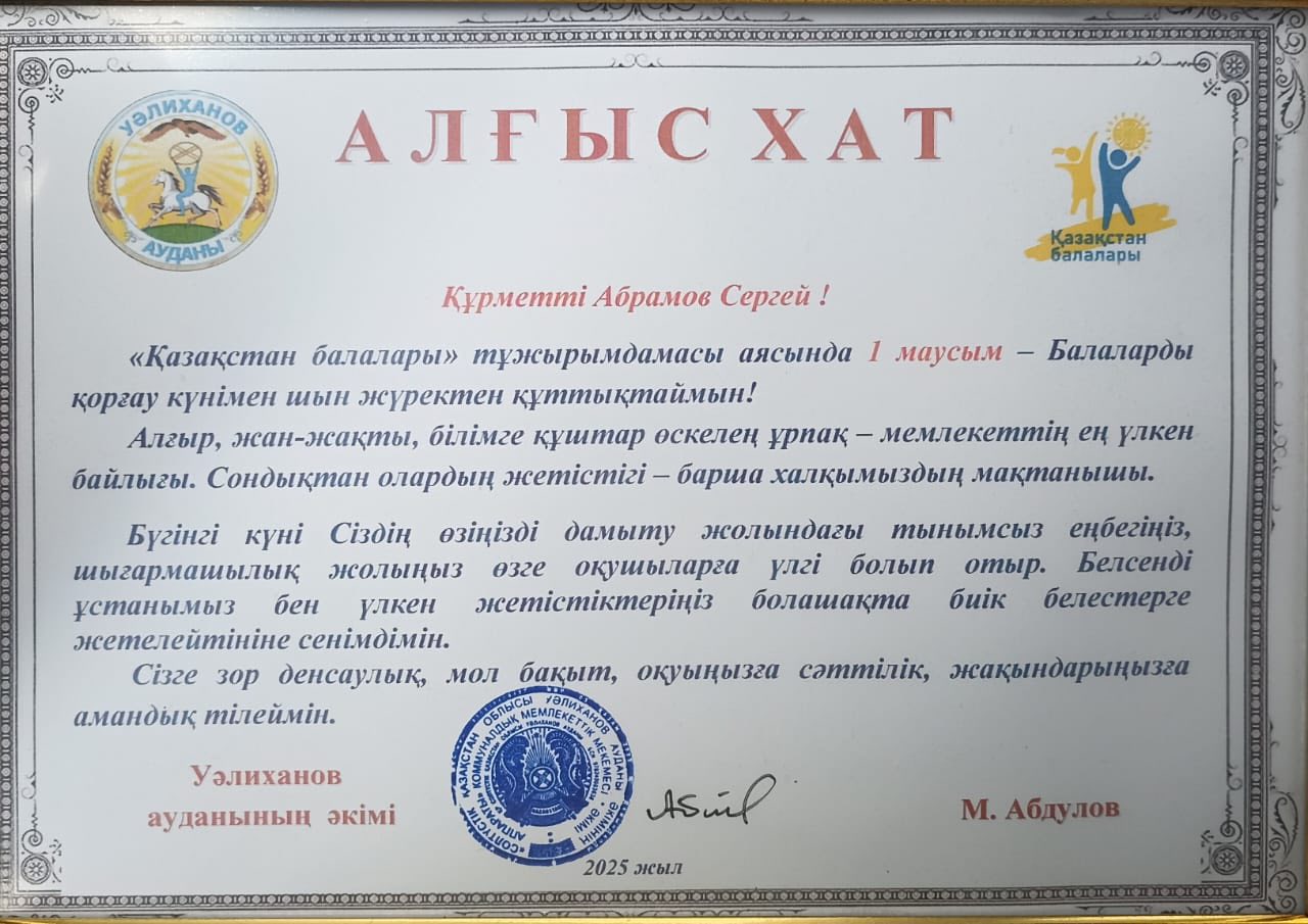 1 маусым Халықаралық балаларды қорғау күніне орай Уәлиханов ауданының әкімі Мұрат Тоқмағанбетұлы Абдулов аудан бойынша жыл бойы жетістікке жеткен оқушыларымызбен кездесу өткізді. Кездесу барысында оқушыларымызды оқу жылының аяқталуымен құттықтап, жылы лебізін білдірді. Жарыстарға қатысқан оқушыларға аудан әкімінің алғыс хатымен марапатталды. Сонымен қатар бағалы сыйлыққа ие болды. Мектебіміздің 10- сынып оқушысы Абрамов Сергей қатысты.
