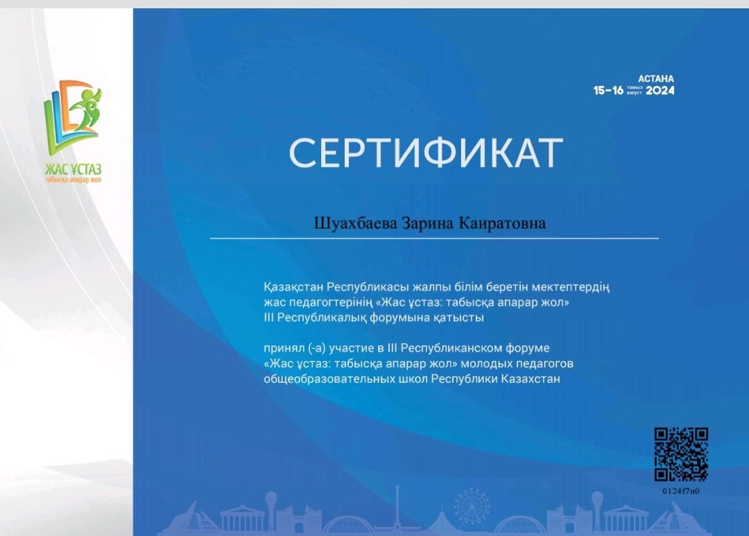 Педагог Чеховской средней школы учитель английского языка Шуахбаева Зарина Кайратовна приняла участие в третьем республикансом форуме молодых педагогов «Жас ұстаз: табысқа апарар жол» который прошел в городе Астана.